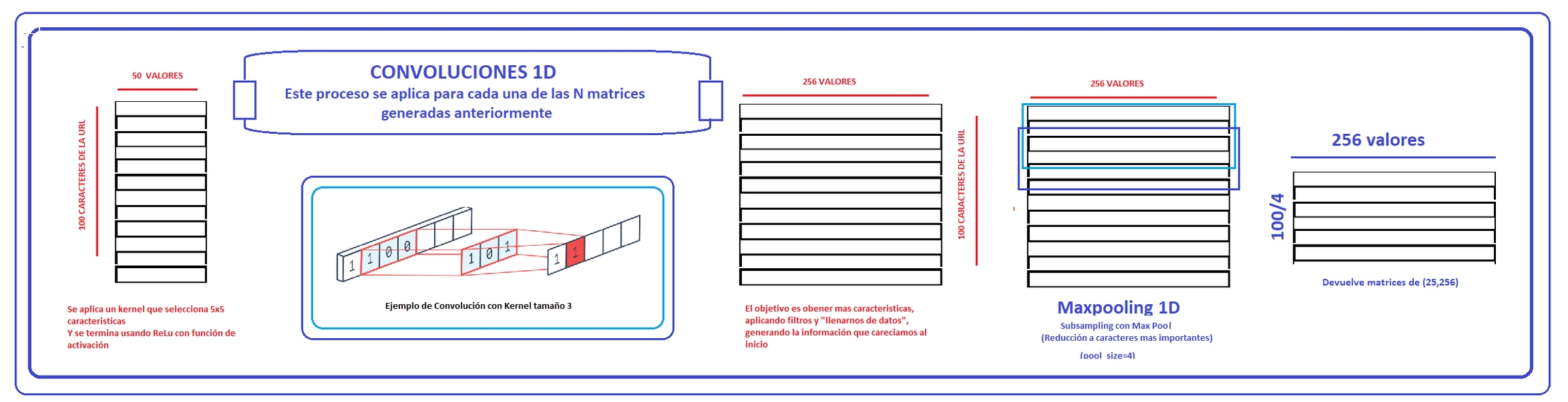 Luego de ello (haber generado una matriz de dimensiones (100,256) por cada URL, se aplica el MaxPooling en 1D con la intención de empezar a reducir, manteniendo la información más relevantes.(Después de ello tenemos una matriz de dimensiones (25,256).