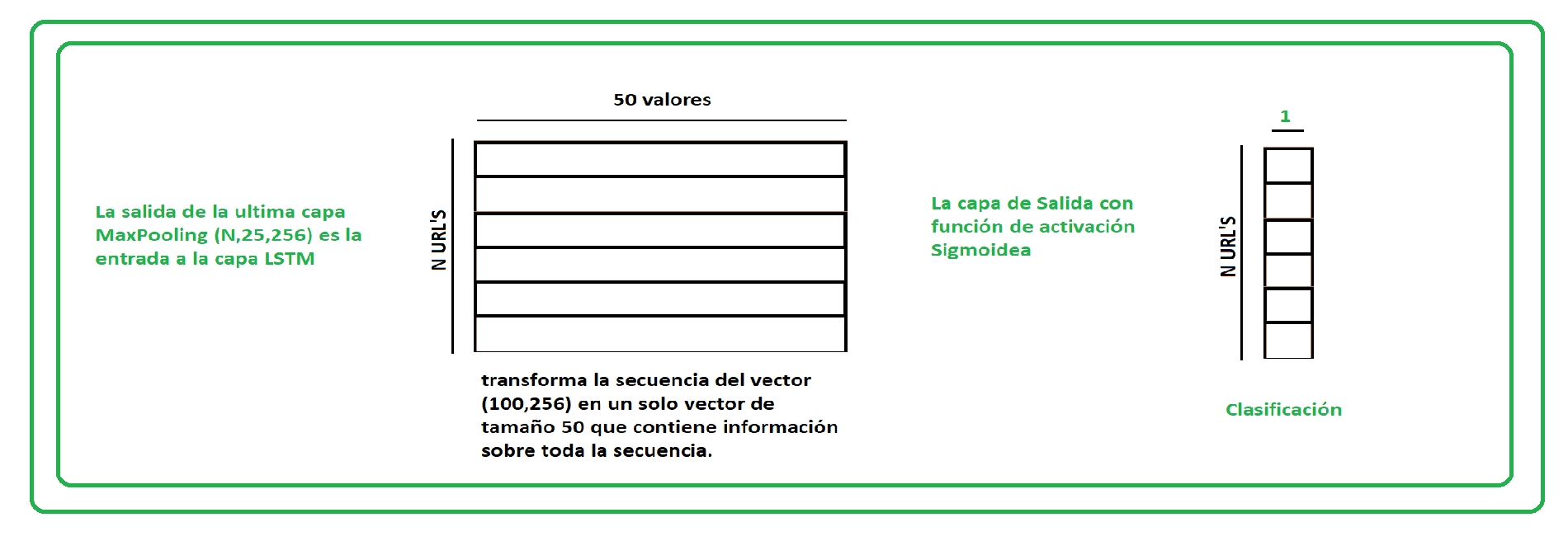 La salida de la capa Max Pooling es de una dimensión de (N,25,256) donde N es la cantidad de URL dadas para el entrenamiento.La salida de la última se utiliza como entrada para una LSTM la cual transforma la matriz (25,250) en un vector de dimensión 50, el cuál concentra la información esencial.Por ende, la salida de esta capa es una matriz de dimensiones (N,50)