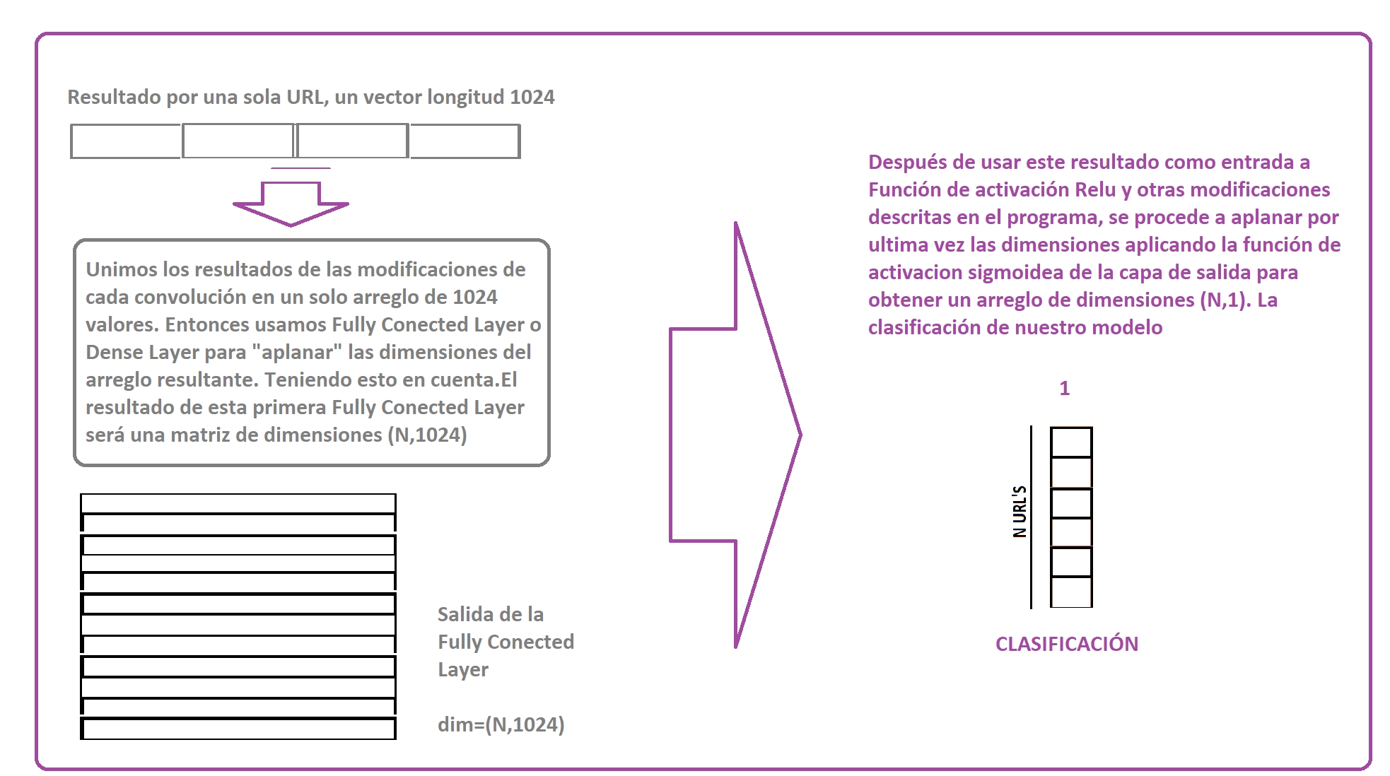 Esa matriz sirve como entrada para diferentes capas con función de activación Relu y modificaciones (normalizaciones.) Despues de ello, tenemos la capa de salida con función de activacion sigmoidea, la cual nos muestra las probabilidades de cada URL